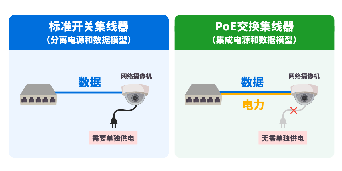 标准的交换集线器既需要LAN电缆来传输数据,也需要单独的电缆来供电。使用支持PoE的设备无需单独的电源布线,简化了布线并扩展了安装灵活性。