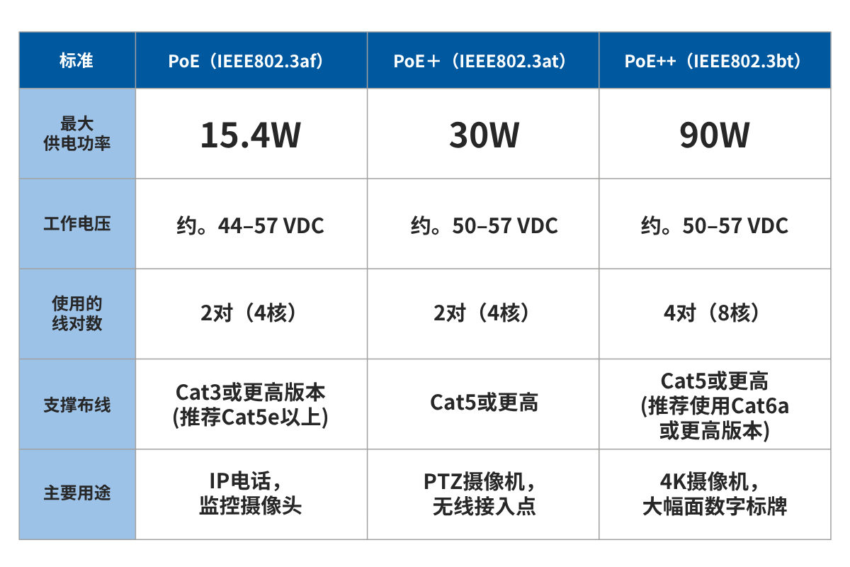 在电源容量方面,PoE (IEEE802.3af) 最大支持15.4 W, PoE+ (IEEE802.3at) 最大支持30 W, PoE++ (IEEE802.3bt) 最大支持90 W。