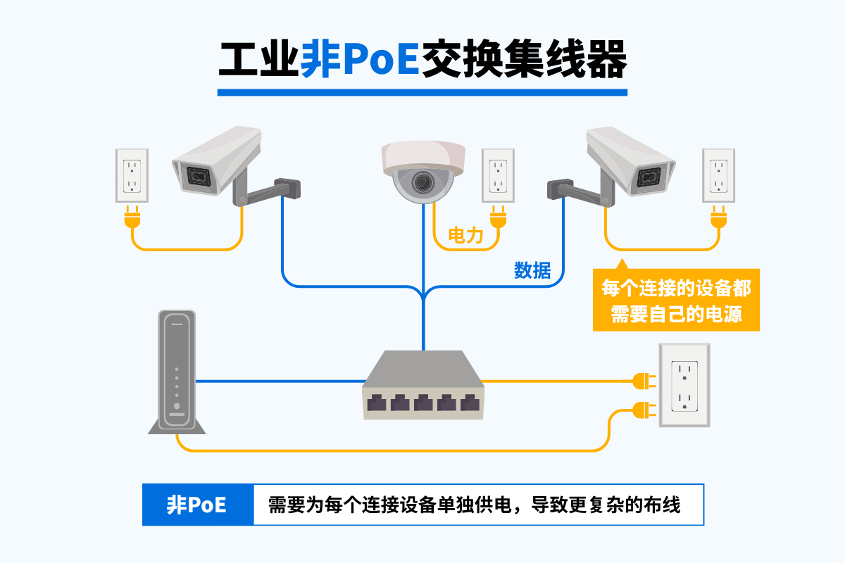 标准的交换集线器既需要LAN电缆来传输数据,也需要单独的电缆来供电。使用支持PoE的设备无需单独的电源布线,简化了布线并扩展了安装灵活性。
