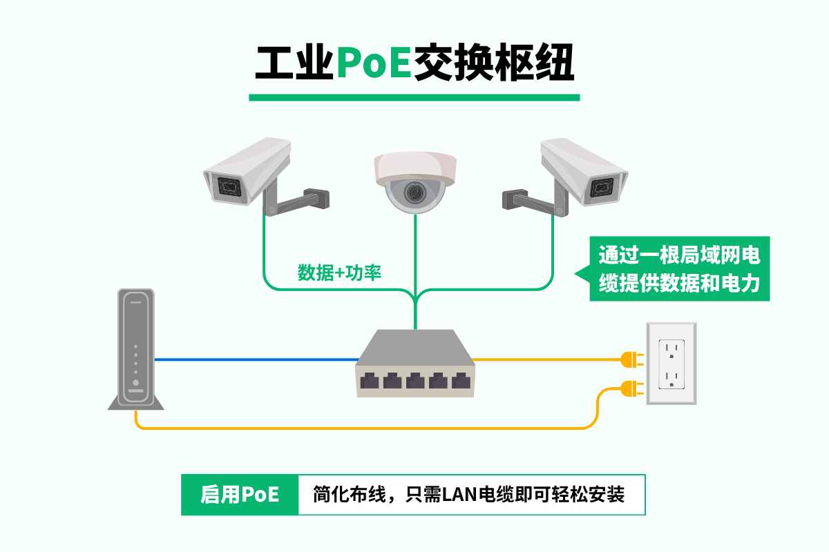 工业用PoE交换机通过一根以太网电缆实现数据和供电,这是其主要优势之一。这使得即使在电源难以提供的地方也可以安装设备,这使得PoE在具有广泛分布的摄像头和传感器的工业环境中特别有用。