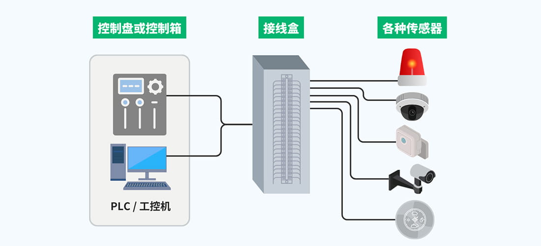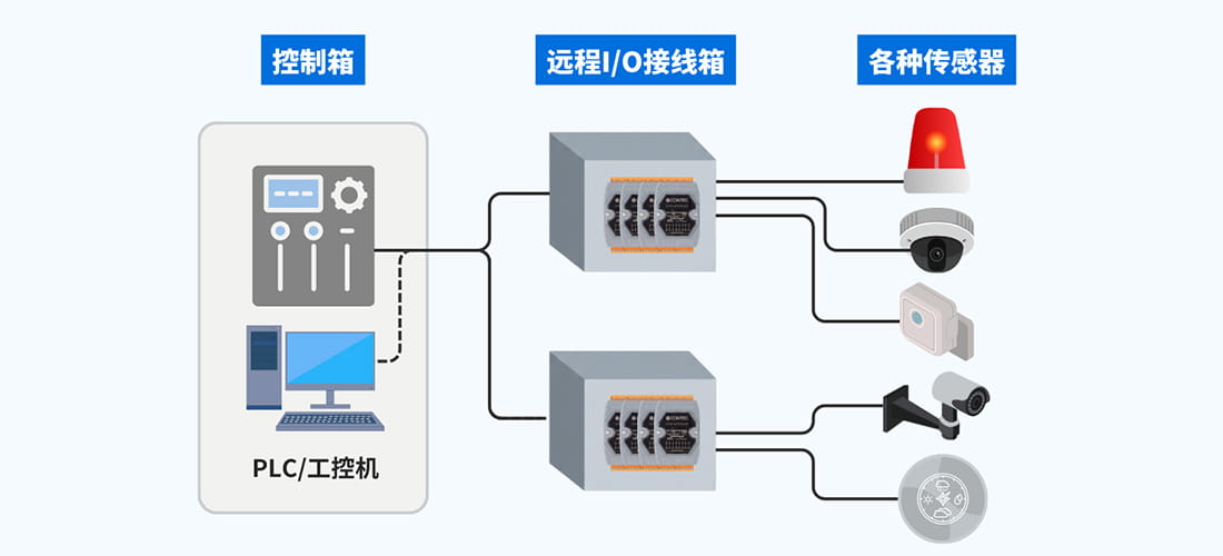 在传统的工厂布线中,所有的控制设备都单独地连接回控制柜。随着连接点数量的增加,I/O卡和端子成倍增加,控制柜布线变得越来越复杂。