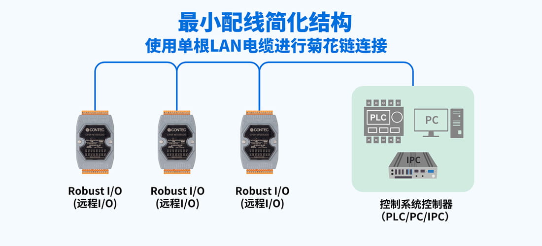 菊花链布线也用于许多远程I/O系统,而Robust I/O系列将其作为核心功能,结合了高耐用性和可用性以及广泛的适用性。传感器和执行器 (如电机和阀门) 的现场布线可以合并成短电缆,而控制柜只需使用一根网线即可连接。因此,布线可以更加简单,大大提高设备布局和系统设计的灵活性。