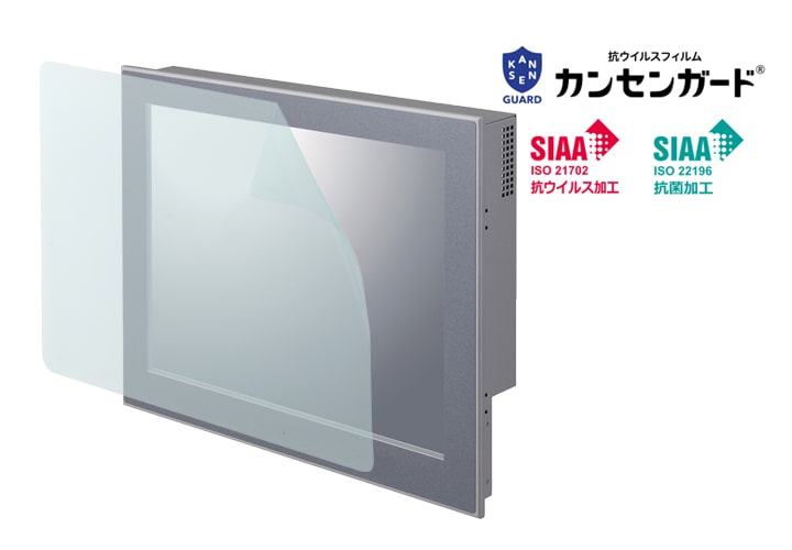 新製品は、当社パネルコンピュータ(PTシリーズ)、フラットパネルディスプレイ(FPDシリーズ)に対応した抗ウイルス・抗菌加工されたタッチパネル用保護フィルムで、10.1インチ、12.1インチ、15インチの3サイズをご用意しています。SIAA(抗菌製品技術協会)の安全基準に適合した「カンセンガード®※」を採用し、液晶タッチパネル画面を傷つきから保護するだけでなく、付着したウイルスや細菌を短時間で減少させる機能性フィルムです。