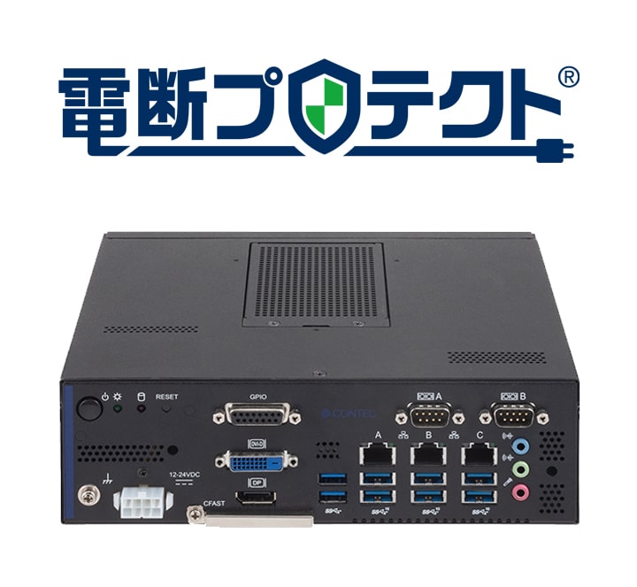 電源障害からのデータ保護とストレージへの書き込みを禁止する「電断プロテクト®」機能を搭載。Windows IoT Enterpriseのロックダウン (ディスク書き込み抑制) 機能と併用することで、シャットダウン処理なしで安全に電源OFFすることが可能です。また、突然の電源断によるファイルシステムやデータの破損を防ぐことができます。
