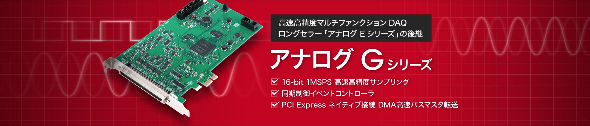 アナログ Gシリーズは、PCベースの高性能アナログ計測デバイスの主力として長年支持されてきたロングセラー製品「アナログ Eシリーズ」を受け継ぐ後継デバイスです。変換ケーブル (DT-G2E-16/DT-G2E-32) を使用することでアナログEシリーズのコネクタピンアサインが再現されますので、アナログEシリーズ用のアクセサリ、ユーザー設計資産をそのまま流用することができます。※