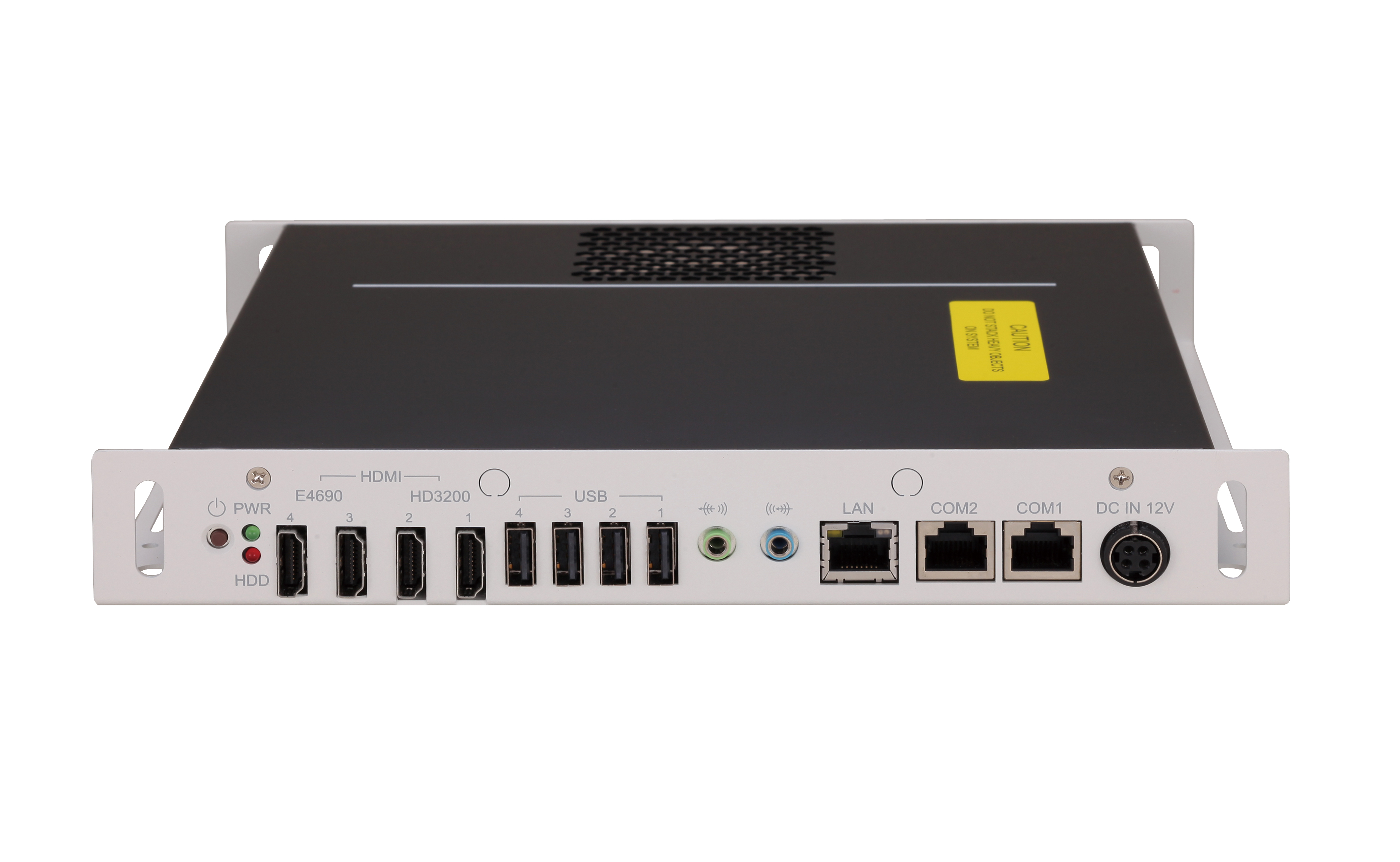 新製品 DS-280Hは、4つのフルHD(1080p)画面を同時表示でき、強力な2D/3Dグラフィックスアクセラレータを搭載したハイパフォーマンスモデルです。4つのHDMIポートを装備し、CPUにはAMD®社の組み込み機器向けCPU「Athlon™ II XLT V66C 2.8GHz(TDP 45W)」を、GPUにはチップセット780E内蔵の「Radeon™ HD3200」に加え、ディスクリートGPUの「Radeon E4690」を搭載しています。厚み35mmのスリム設計ですので、什器内や内装壁の内側などの限られたスペースでも設置することができます。