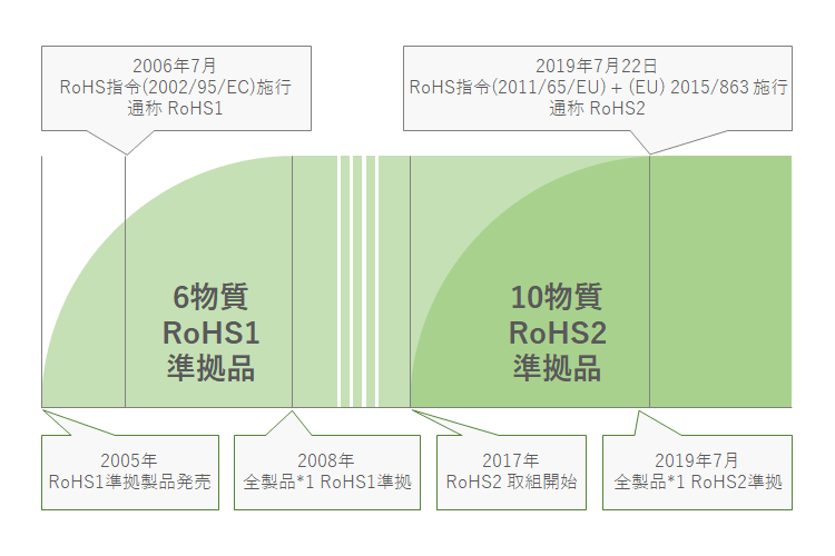 2015年6月4日に改正公布されたEU官報「(EU) 2015/863」に基づき2017年より環境負荷物質10物質を非含有とするRoHS2準拠化の取り組みを開始し、同公布が施行される2019年7月22日時点の販売中製品※1、および以降販売開始する製品※1をRoHS2準拠品とする計画です。