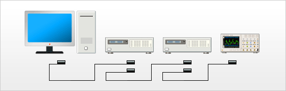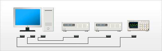 1台のパソコンに複数の計測器を接続し、プログラムによって各機器が自動計測を行い、その計測したデータをパソコンで収集し、解析や表示処理、データ保存するという使われ方が一般的になっています。