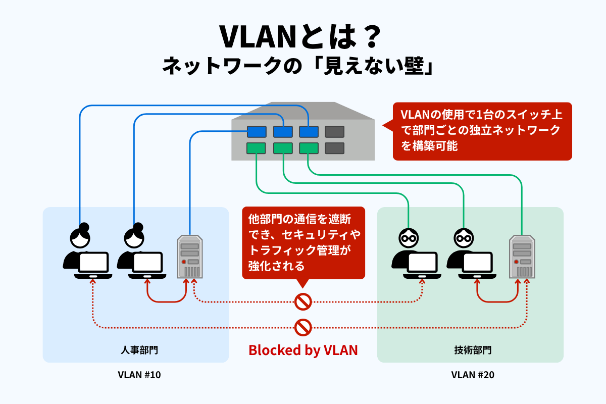 VLAN(Virtual Local Area Network)とは、物理的な接続構成に関係なく、ネットワークを仮想的に分割できる技術です。