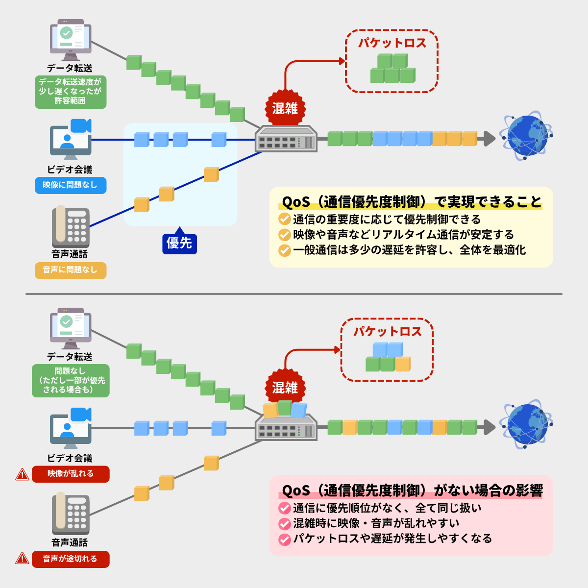 QoS(Quality of Service)とは、ネットワーク上で複数の通信が同時に行われる際に、データの通信順序や通信量を制御して、特定の通信を優先的に扱う技術を指します。