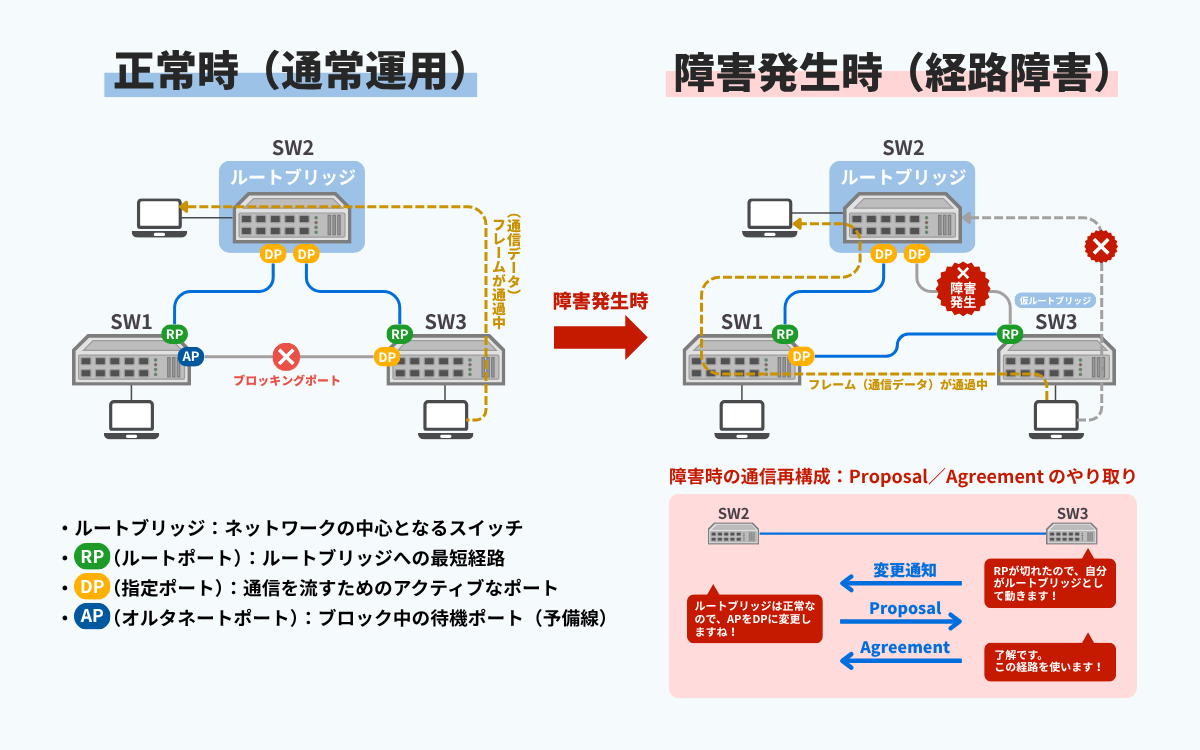 この仕組みにより、数秒程度で復旧可能な安定したネットワーク環境を維持できます。RSTPは、同じ役割を持つ従来のSTP(Spanning Tree Protocol)を高速化した規格であり、障害発生時の通信経路切り替えにかかる時間を大幅に短縮できる点が特徴です。