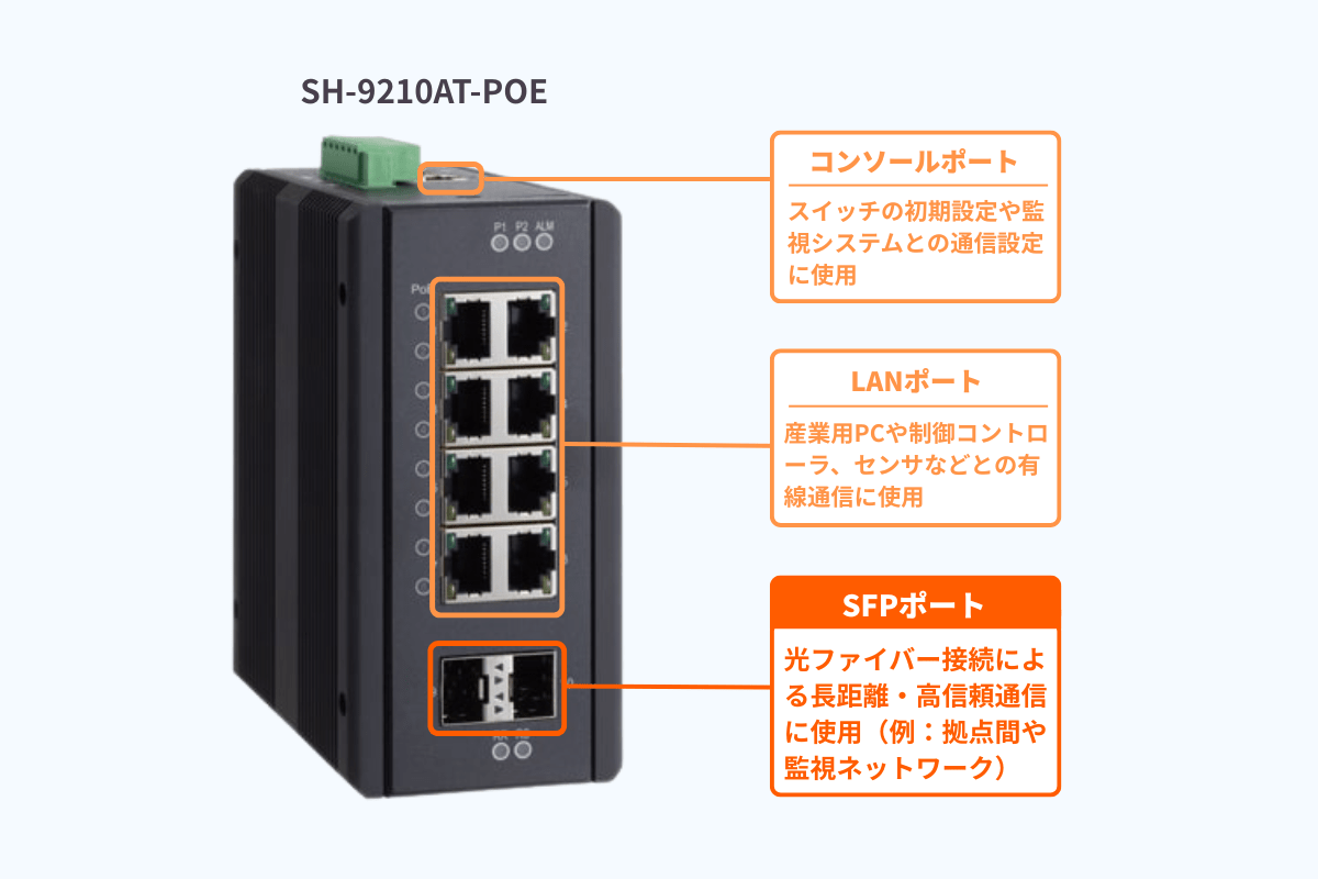 SH-9210F は、8ポートのRJ-45と2ポートのSFPスロットを備え、光ファイバー接続を含む柔軟なネットワーク構成に対応できる産業用マネージドスイッチングハブです。