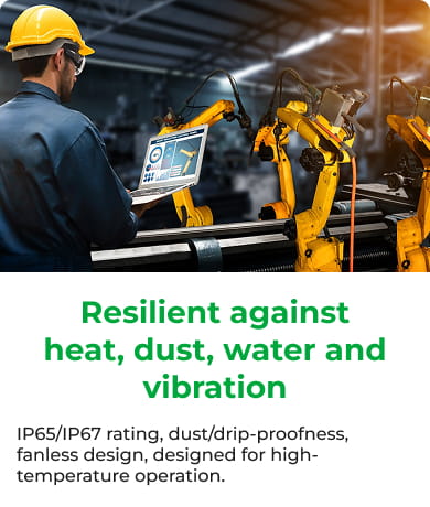A 15-inch industrial panel-mount touch screen PC with a 13th-generation Intel® processor and IP65 rating.