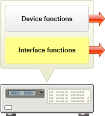 - Devices functions are device-dependent components that are not defined in the GPIB standard. They include device-dependent commands, device operation methods, and measurement range configuration methods.
